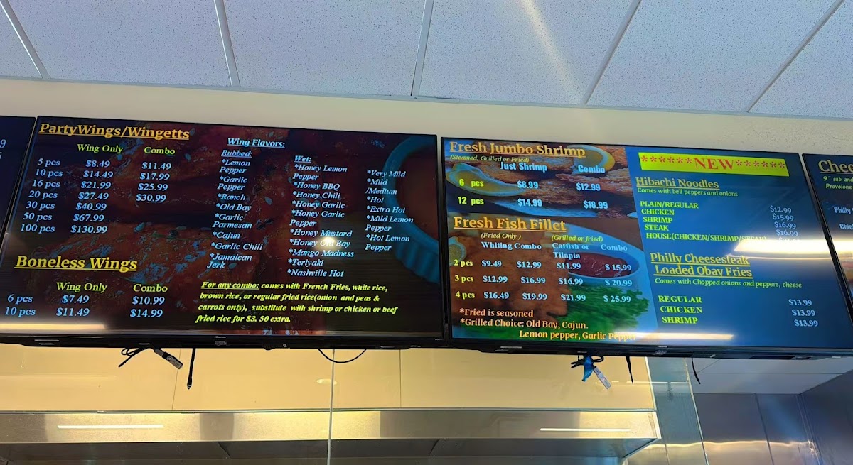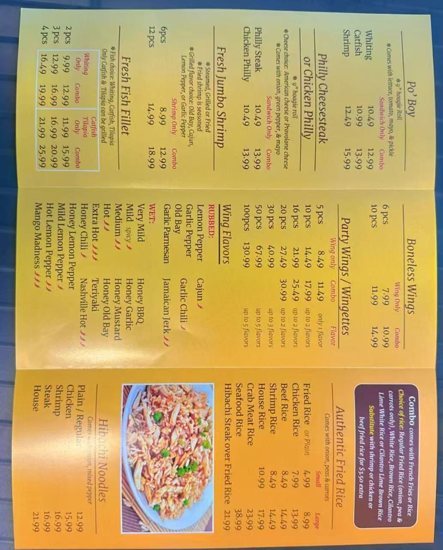 Grilled or fried, fish choices are: whiting, catfish, tilapia, fried fish is seasoned, grill flavor choices: old bay, lemon pepper, garlic pepper, Cajun.