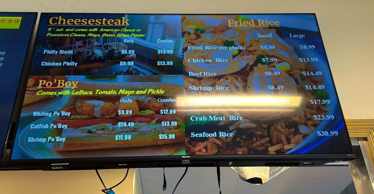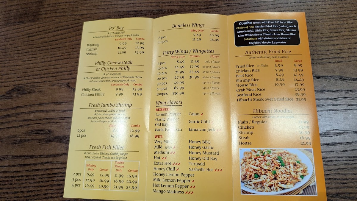 Six boneless chicken wings with choice of dry rubs or wet sauces, including Lemon Pepper, Old Bay, and Honey Garlic. Served with French Fries or various Fried Rice options.